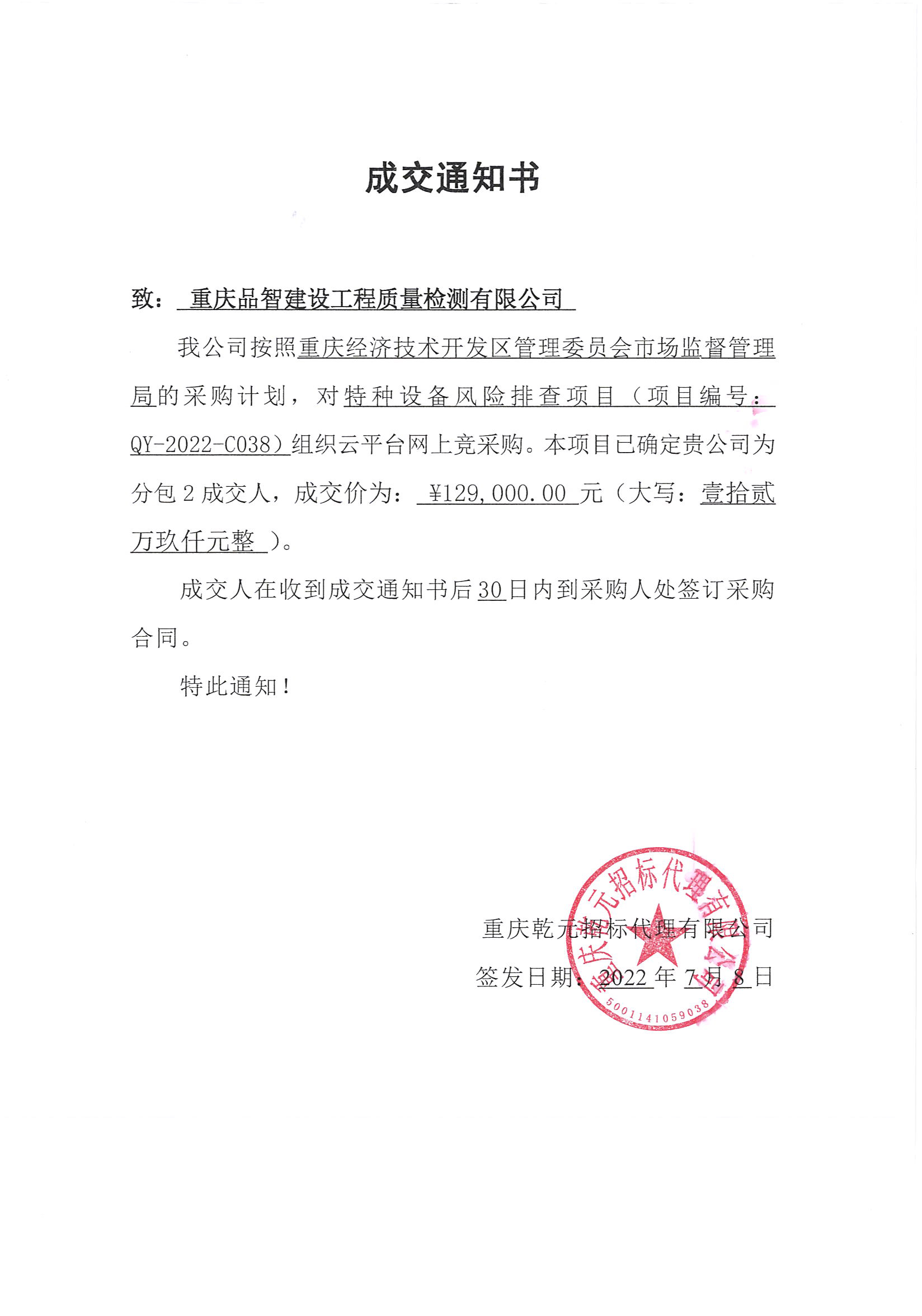 2022年7月电梯检验中心成功中标了重庆经济技术开发区管理委员会市场监督管理局特种设备风险排查项目,迎来了电梯检验中心2022年下半年的开门红。